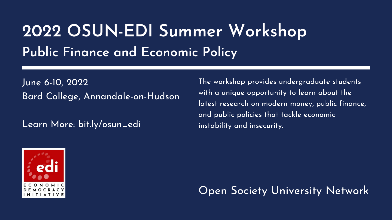 Monday, June 6, 2022 – Friday, June 10, 2022 The Open Society University Network welcomes undergraduate applications for its summer workshop in Public Finance and Economic Policy. Organized and hosted by the OSUN Economic Democracy Initiative, this five-day workshop is for undergraduate students interested in public policy to tackle economic instability and insecurity, and in understanding the financing capacity and policy space available to governments to pursue these aims. The workshop provides undergraduate students with a unique opportunity to learn about the latest research on modern money, public finance, and public policies that tackle economic instability and insecurity. June 6-10, 2022 Bard College, Annandale-on-Hudson, NY, USA All undergraduate students, regardless of whether they attend an OSUN institution or not, are welcome. Applicants from partner OSUN institutions are eligible for financial assistance and are especially encouraged to apply. COVID and the climate crisis have taught us that governments must act decisively to tackle the most pressing challenges before us, and not leave solutions exclusively to private actors. These developments have led to a rethinking of the role of the state on a global scale. How shall we think about the policy options before different governments? What are their abilities to achieve them? What kind of real or financial constraints do they face? This workshop will provide students with a new framework for thinking about these questions and with concrete tools and techniques to explore these policy-relevant concerns. Download: OSUN-EDI Summer Workshop Description.pdf |