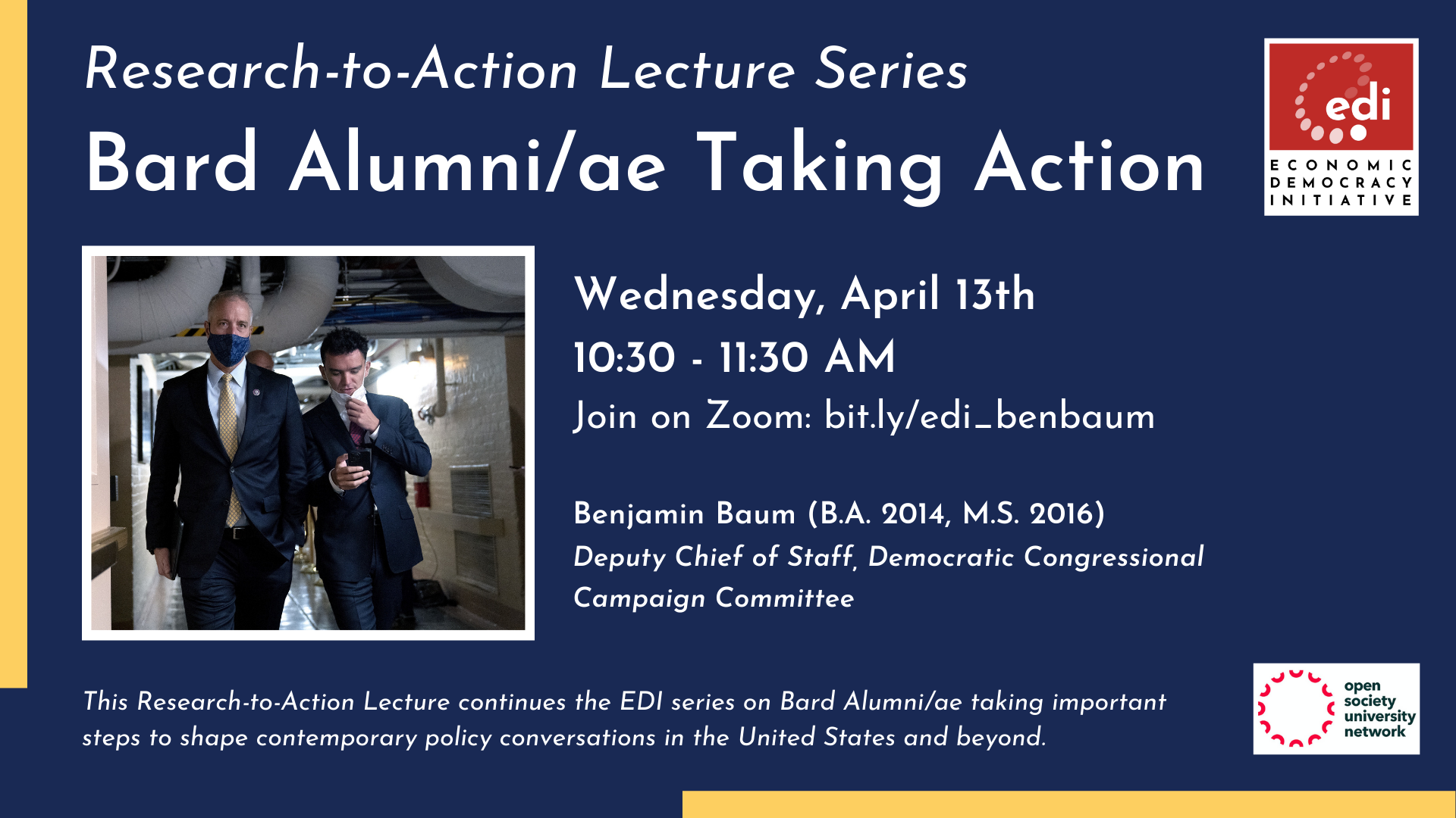 Wednesday, April 13, 2022 Online Event 10:30 am – 11:30 am EDT/GMT-4 Ben Baum is the Deputy Chief of Staff and Member Services Director for Congressman Sean Patrick Maloney (NY-18). He has worked for the Congressman since 2017 when he was a junior at Bard College. During Ben’s time in Washington, he has served as a senior staffer on the Congressman’s campaigns and most recently as the Deputy Chief of Staff at the Democratic Congressional Campaign Committee. This Research-to-Action Lecture continues the EDI series on Bard College Alumni/ae taking important steps to shape contemporary policy conversations in the United States and beyond. |
