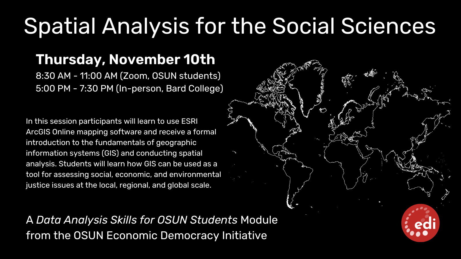 Thursday, November 10, 2022 Online Event 8:30 am – 11:00 am EST/GMT-5 There are two opportunities to attend: Online 8:30 AM - 11:00 AM (NY) | 2:30 PM - 4:00 PM (Vienna) Register in advance for this meeting In-Person 5:00 PM - 7:30 PM NY Bard College, Annandale-on-Hudson Old Henderson PC Lab 101A In this session, participants will learn to use ESRI ArcGIS Online mapping software and receive a formal introduction to the fundamentals of geographic information systems (GIS) and conducting spatial analysis. Students will learn how GIS can be used as a tool for assessing social, economic, and environmental justice issues at the local, regional, and global scale. Spatial data analysis can be used to reveal information previously hidden from plain sight. Using geographic information systems, policy issues can be addressed hands-on with real world data. Learning Outcomes: An introduction to the capabilities of GIS science and its limitations Develop an appreciation of how spatial analysis can play a critical role in the creation, implementation, monitoring, and evaluation of social, economic, and environmental policy issues |